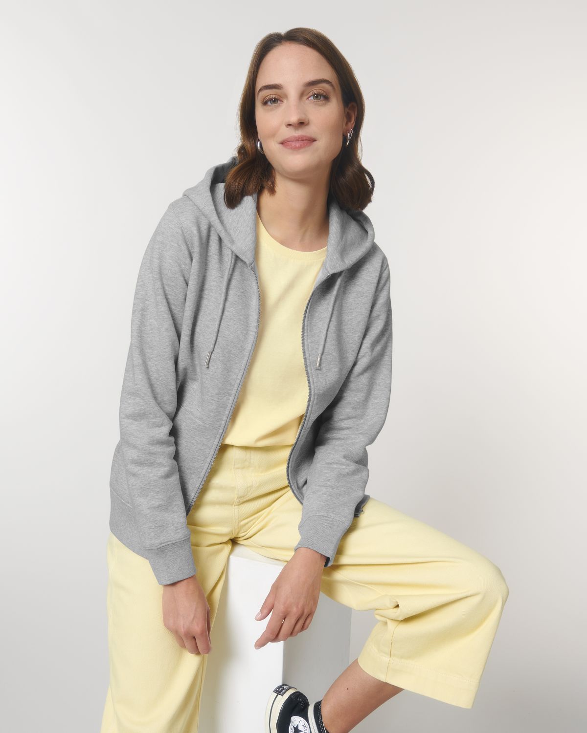 Our premium unisex hoodie sweatshirt in brushed 350gsm fleece, 85% organic cotton and 15% recycled polyester. Featuring a lined hood that offers sturdy and durable wear, plus matt silver metal eyelets and drawcord tipping. Classic kangaroo pocket design and a half-moon at back of the neck.