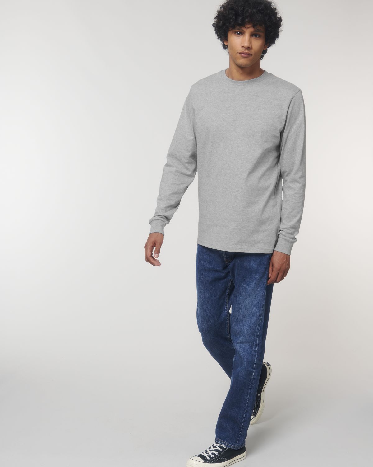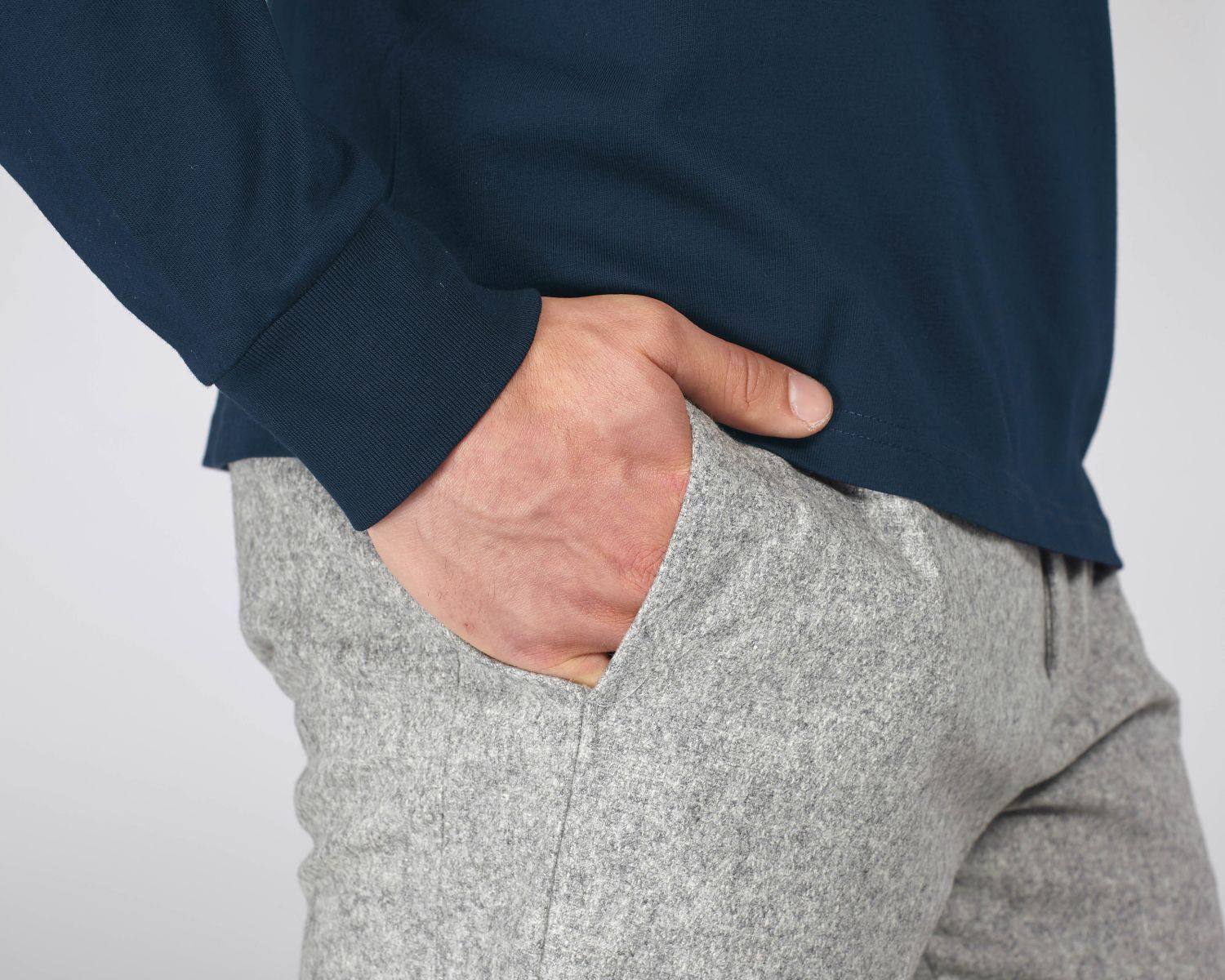 Medium Fit, Set-in sleeve, 1x1 rib at neck collar and sleeve hem, Inside back neck tape in self fabric, Bottom hem with wide double topstitch.